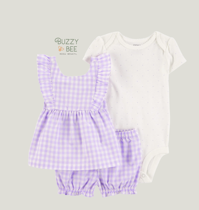 Esse Conjunto xadrez 3 peças lilás | Carter’s é a união perfeita entre conforto, beleza e praticidade — tudo o que os papais precisam na rotina com os bebês. Com tecido macio e modelagem pensada para o bem-estar do pequeno, ele permite liberdade nos movimentos e muito aconchego em cada detalhe. Os designs facilitam na hora das trocas de fralda, especialmente nos dias mais corridos. Além de funcional, o conjunto é cheio de charme, com um visual delicado que deixa seu baby ainda mais fofo para qualquer ocasião. Ideal para passeios, sonecas ou momentos especiais em família.