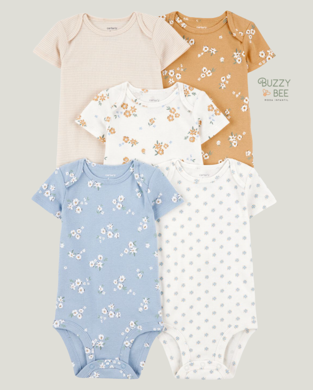 O Kit body 5 peças florido | Carter’s é aquele tipo de escolha que facilita a rotina e acompanha o crescimento do bebê com conforto e praticidade. Feitos em malha de ribana 100% algodão, se ajustam ao corpinho com suavidade, sem apertar. A gola redonda com ombros transpassados torna o vestir mais fácil, especialmente nos momentos em que tudo precisa ser rápido e tranquilo. As mangas curtas protegem na medida certa, e o abotoamento entre as perninhas garante trocas de fralda sem complicação. É o tipo de kit que resolve o dia com leveza, seja em casa ou no passeio.